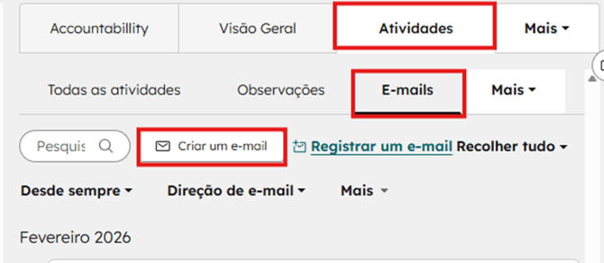 Em seguida clicar em Atividades, E-mails, e em Criar um e-mail.