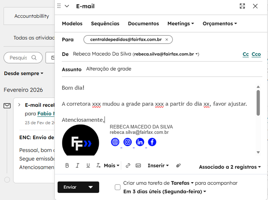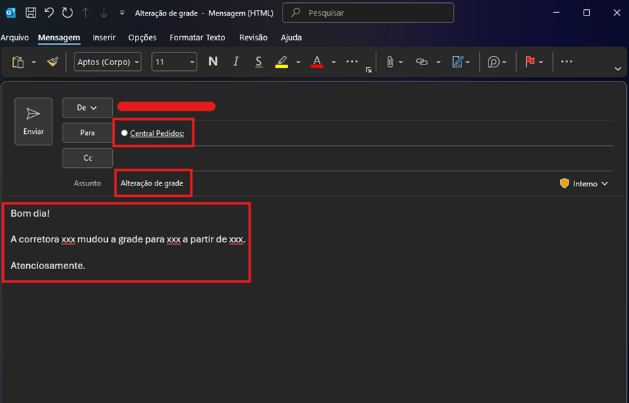 - Formular o corpo do e-mail, e indicar qual a corretora, qual a grade nova, e desde quando a mudança entrou em vigor.